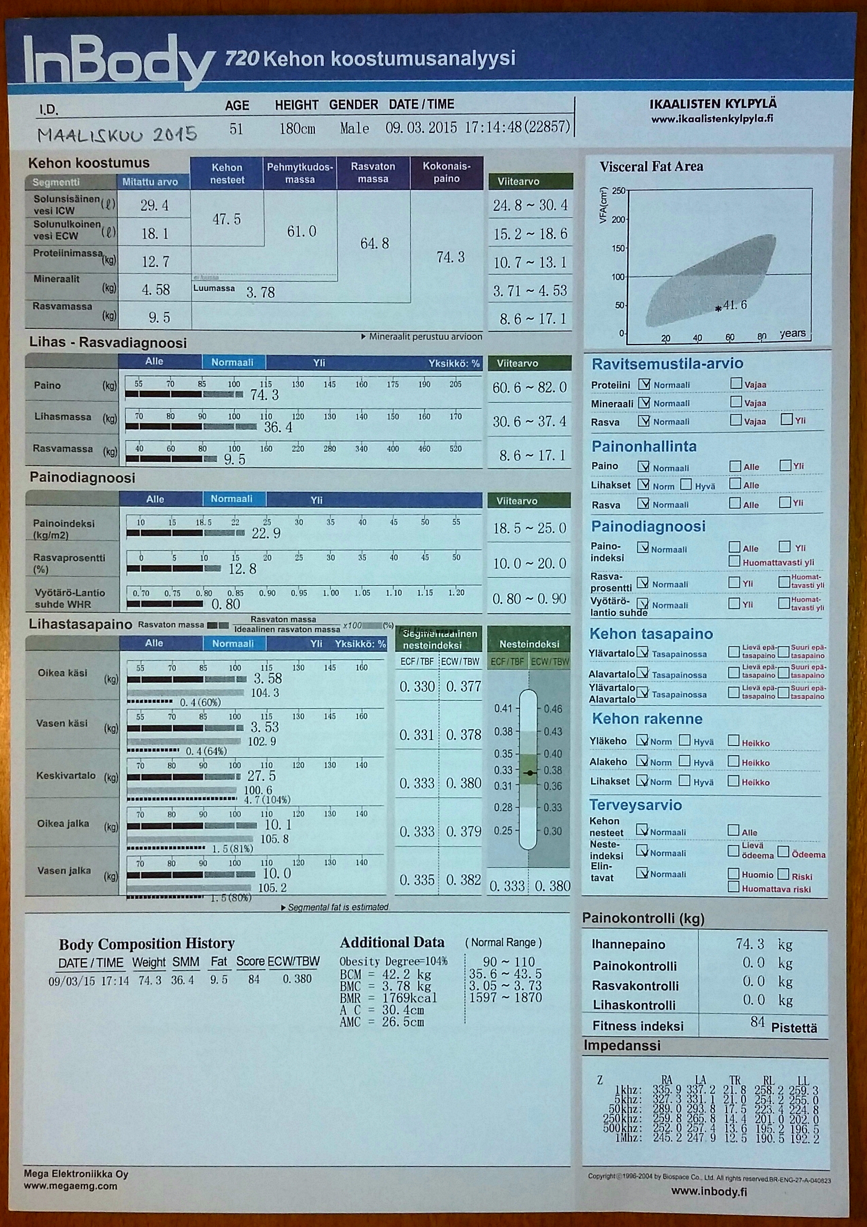 Viimeinen jakso alkaa 9.3.2015 ja heti ensimmäisenä päivänä on vuorossa tuo odotettu ja pelätty kehonkoostumusmittaus. Jännitys tiivistyy hetkeen, jolloin saan mittaustulospaperin käteeni. Odotukset ovat suuret, samoin pettymyksen pelko. Miten äijän käy?