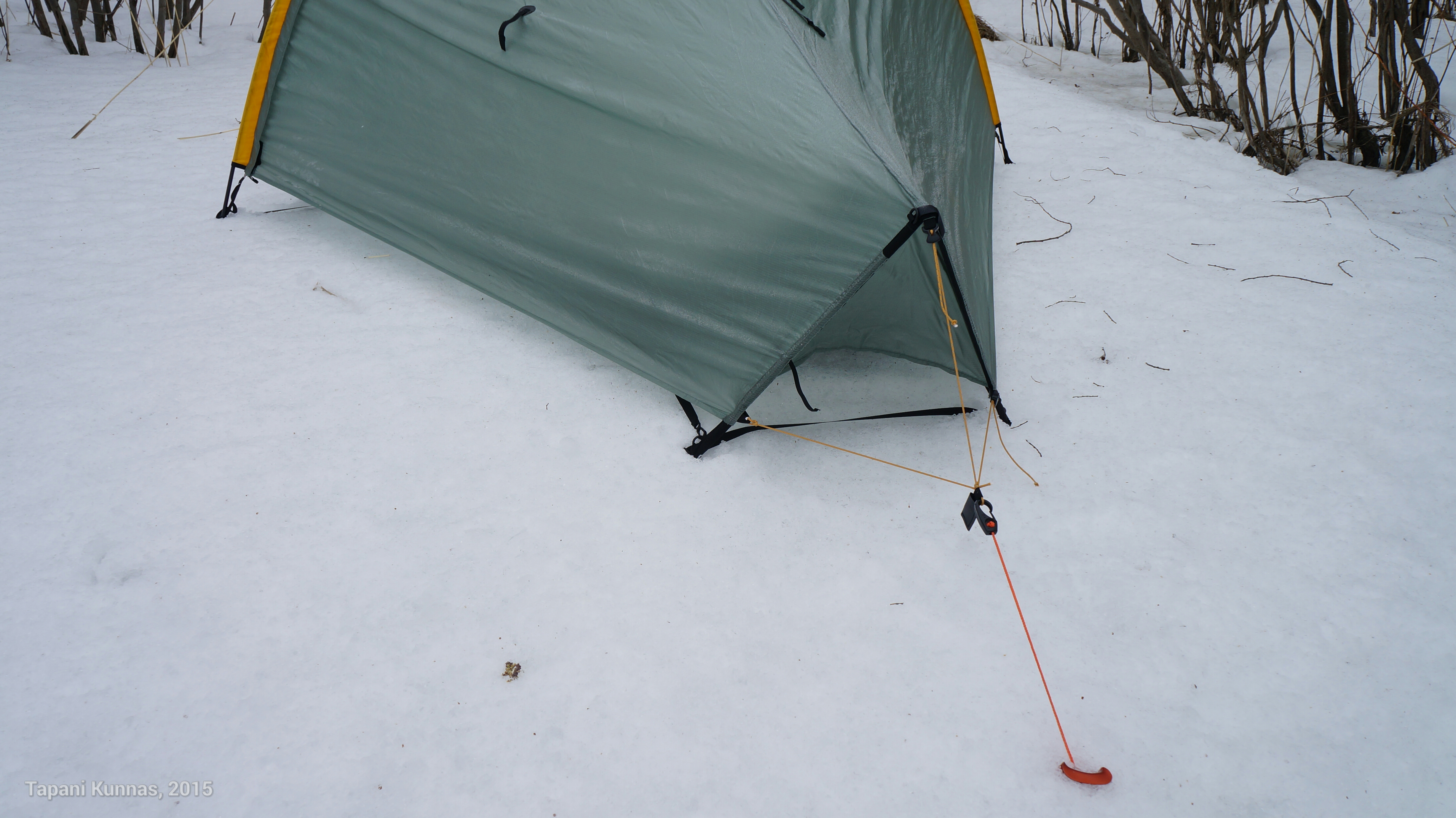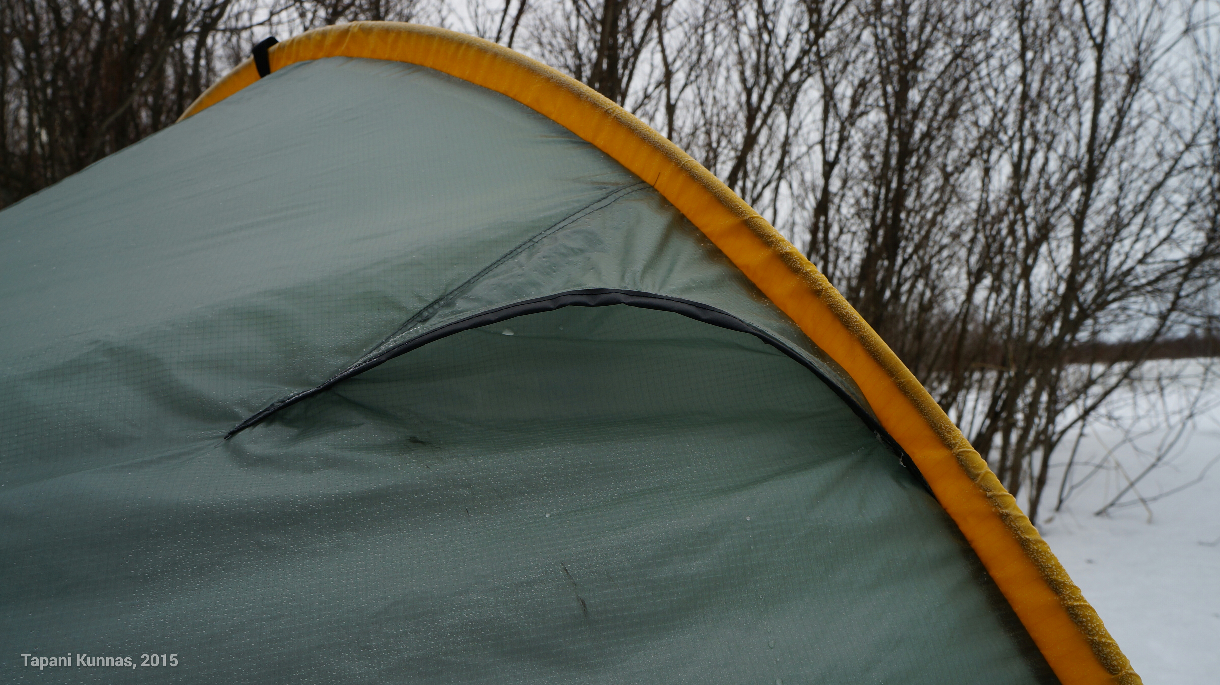 Miinuspuolella Moment DW:ssä on se, että ulkoteltan sivut jäävät kovin korkealle maasta. Pehmeässä maastossa – esimerkiksi jäkälikössä – telttailtaessa tämä ei haittaa, mutta jos alusta on kovin kova, ja ollaan liikkeellä tuulisella säällä, voi teltassa käydä aikamoinen vinkka. Asian voi korjata kaivamalla poikittaiskaaren päitä varten pienet kuopat. Ja toki näppärä telttailija voi vaikka ommella lisäliepeet helmoihin.