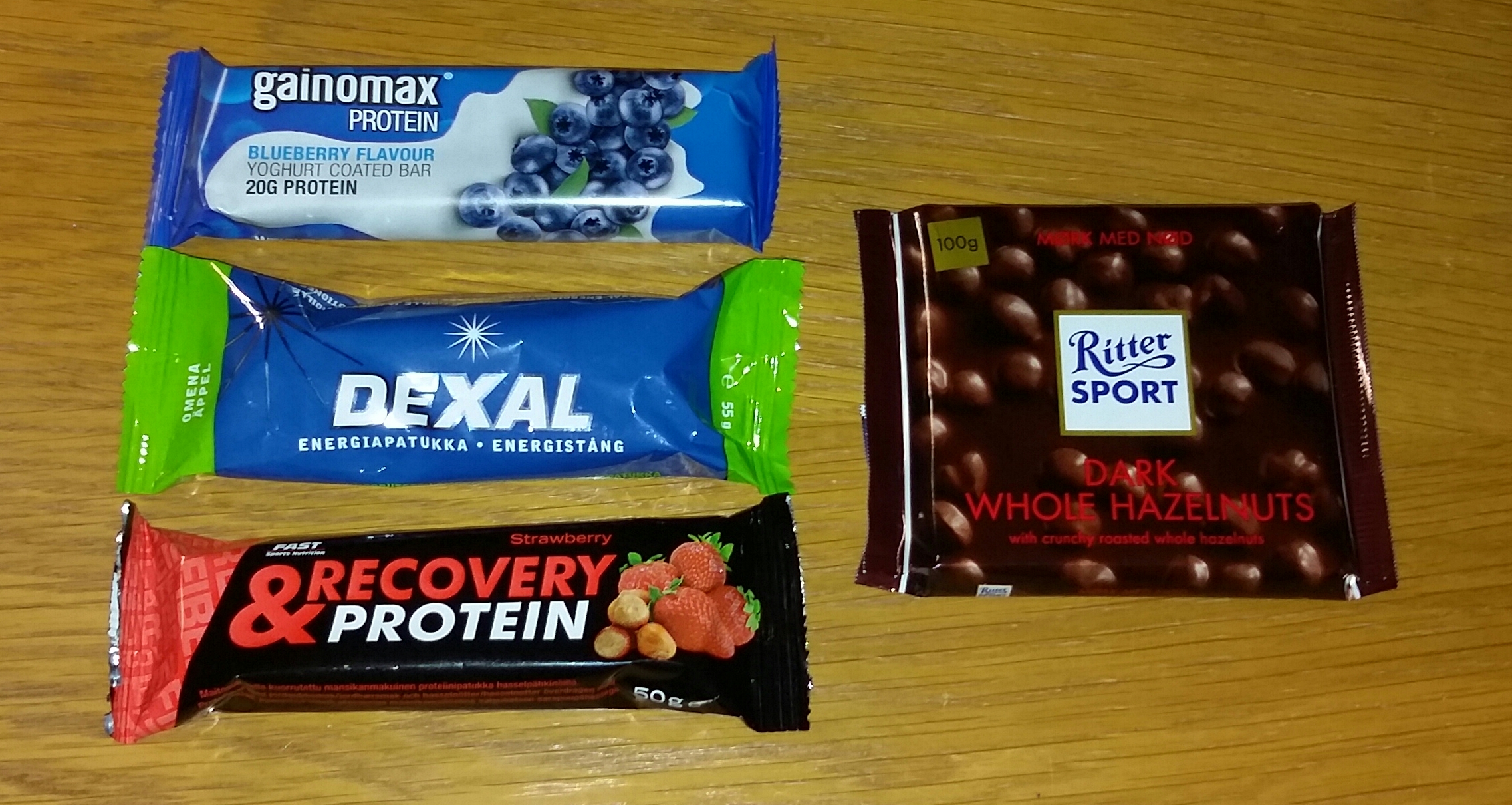 Mutta ne välipalat siis. Seuraavalla retkelläni syön taas suklaata, ja ostin kokeeksi kolme energia/proteiinipatukkaa ja yhden suklaan. Näissä energiamäärät ovat varsin mukavat: