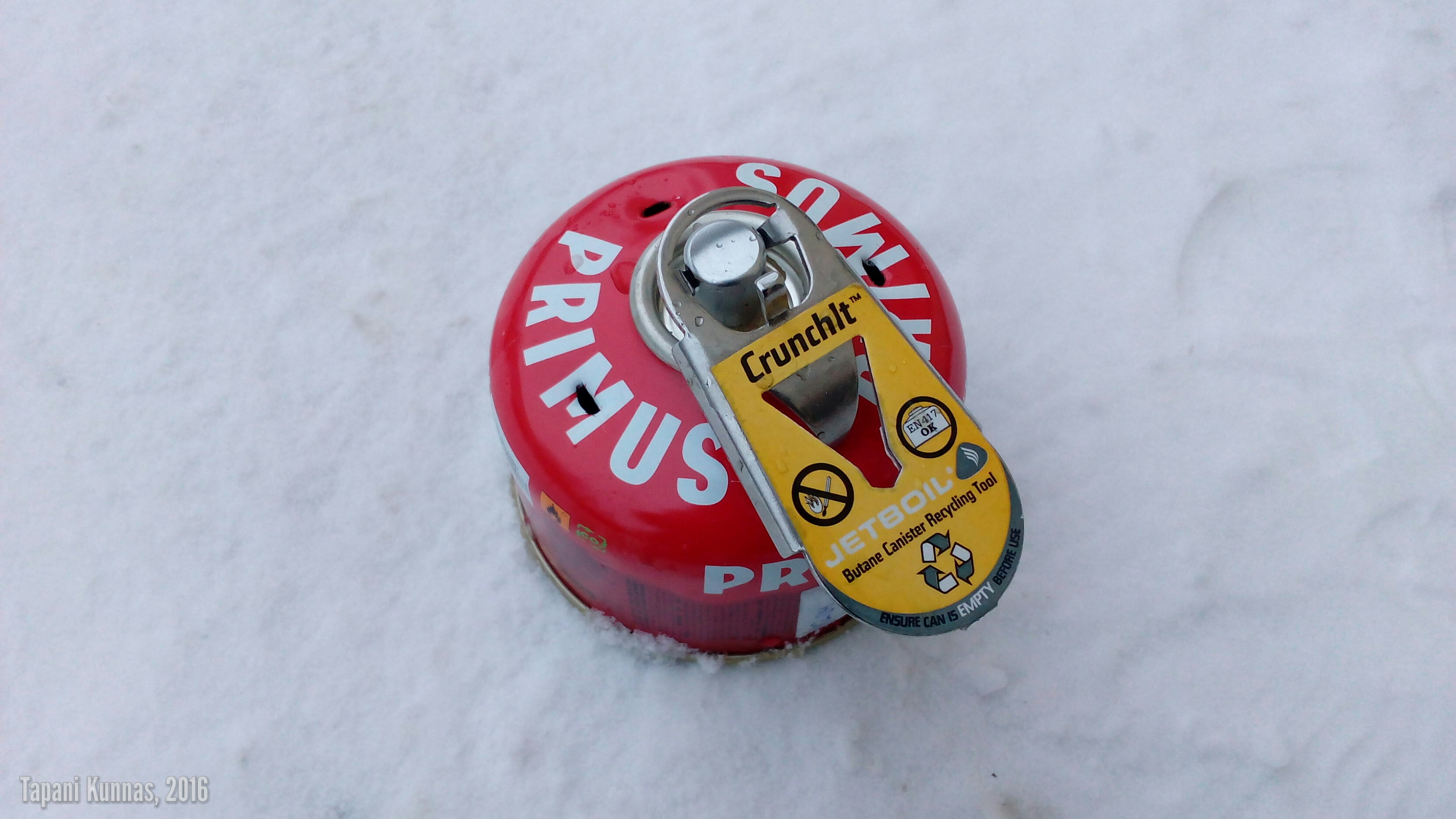 Ainahan niitä tyhjiä rasioita voi kerätä kotiin isomman määrän ja viedä sitten kaikki kerralla ongelmajätepisteeseen. Mutta oma vaivansa siinäkin, eikä kaikilla edes ole ongelmajätepistettä siedettävän matkan päässä kotoa. Ongelmaan on kuitenkin ratkaisu, joka ei ole kallis: Jetboil CrunchIt on noin kymmenen euron hintainen työkalu, jolla tyhjät kaasurasiat valmistellaan poisheittokuntoon kahdessa vaiheessa. Molemmat vaiheet tehdään ulkona ja mielellään tuulisella säällä: