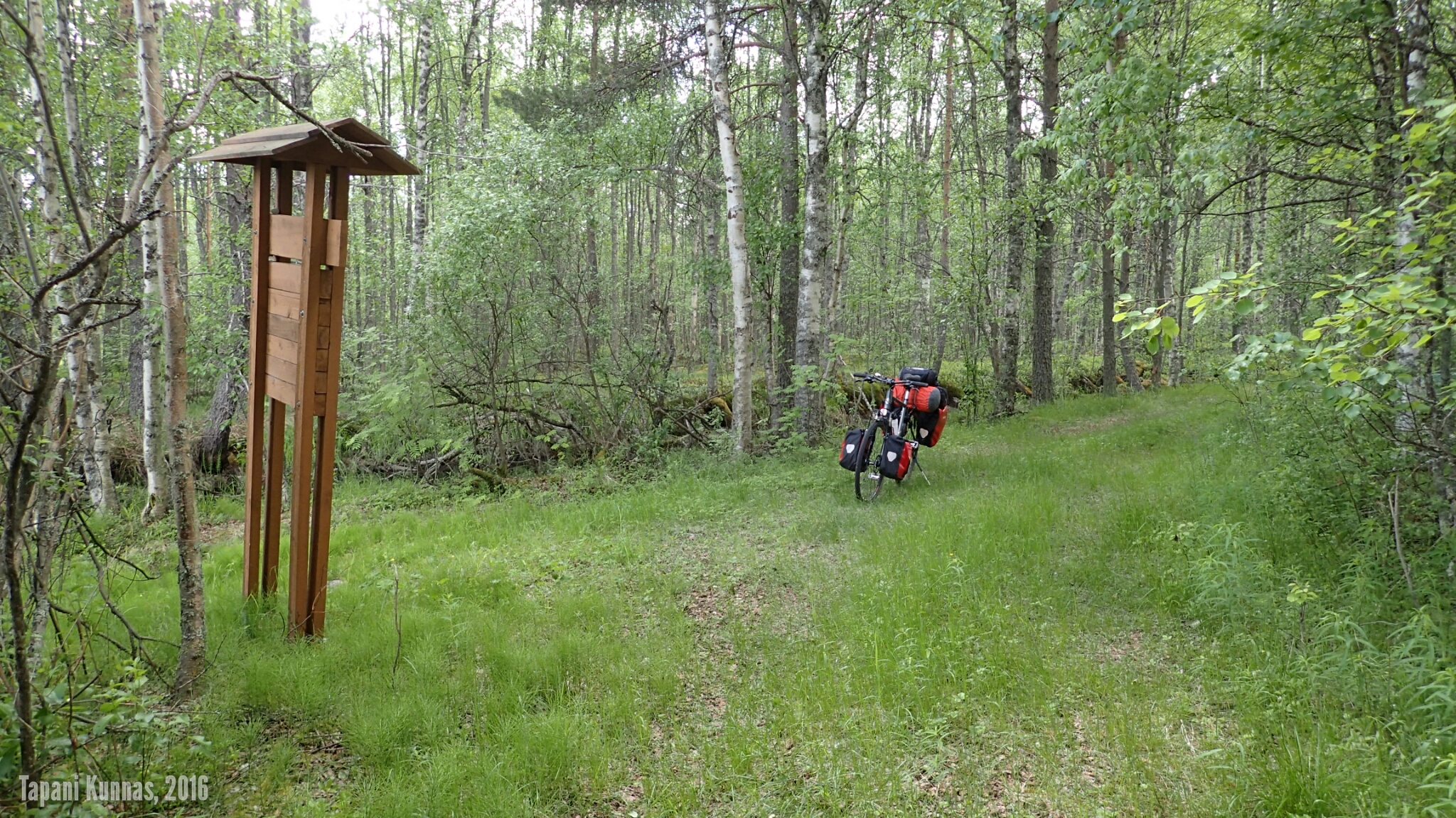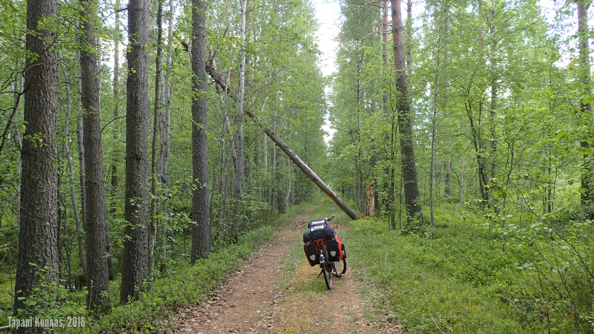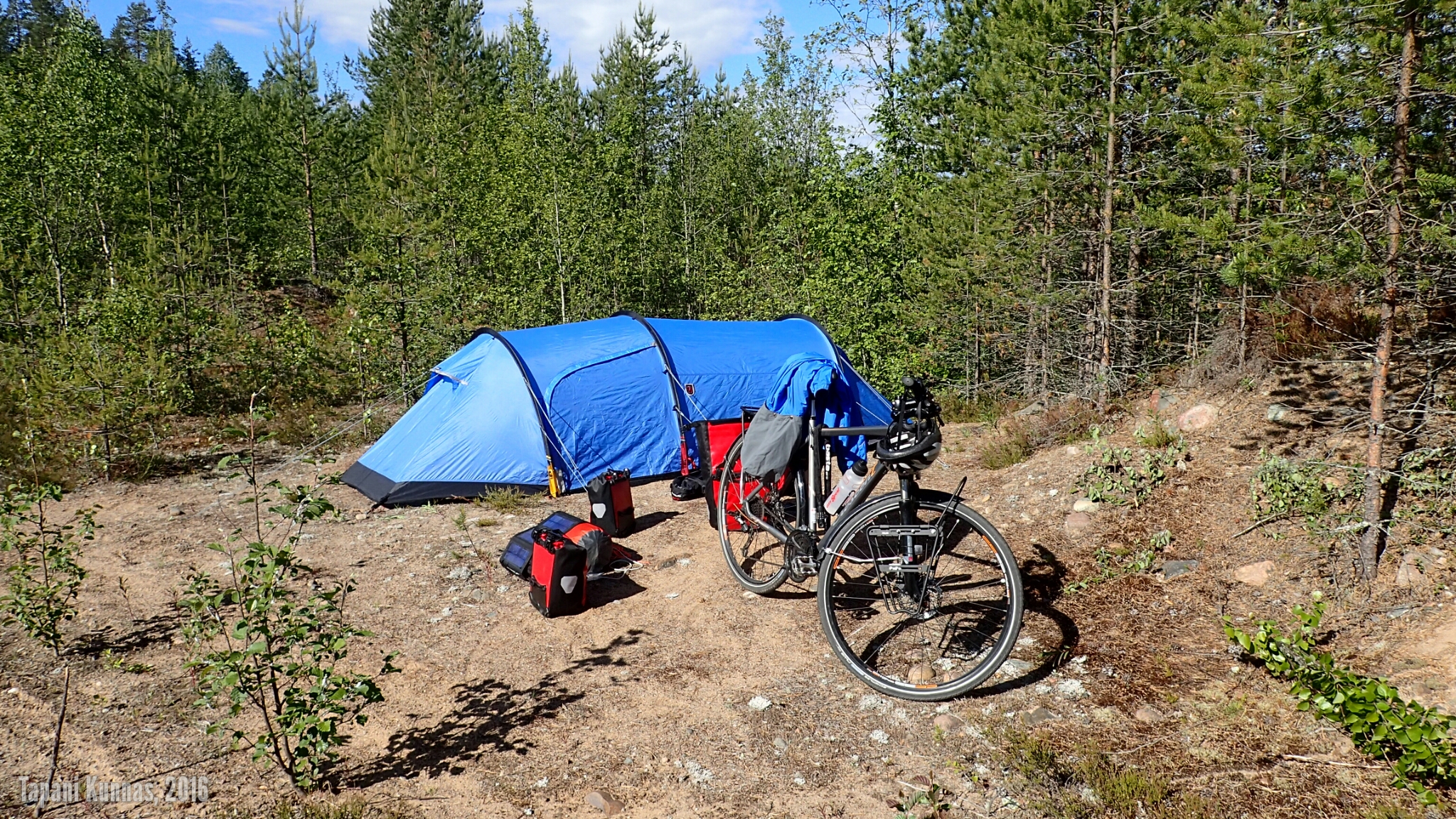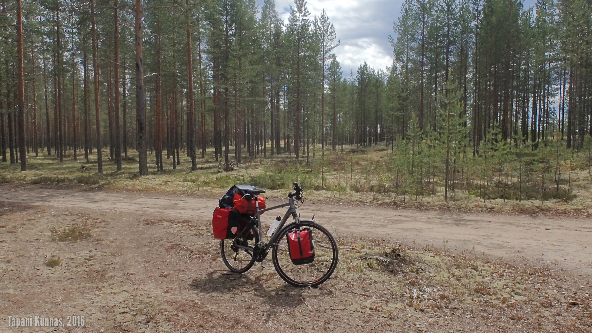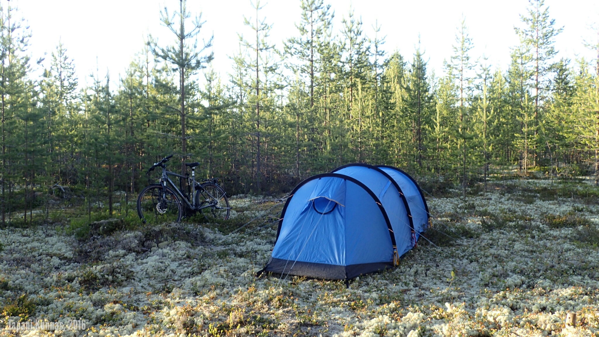 Alkaa olla taas leiriytymisen aika. Olen tänäänkin ajanut yli budjetoidun (60 km), joten huonon sään pelivarani kasvaa entisestään. Tutkin karttaa ja arvioin, mistä leiripaikka voisi löytyä. Jo hieman ennen sitä poikkean tien oikealle puolelle vievälle metsäautotielle ja kun se johtaa keskelle mitä kauneinta jäkäläkangasta, totean leiripaikan löytyneen.