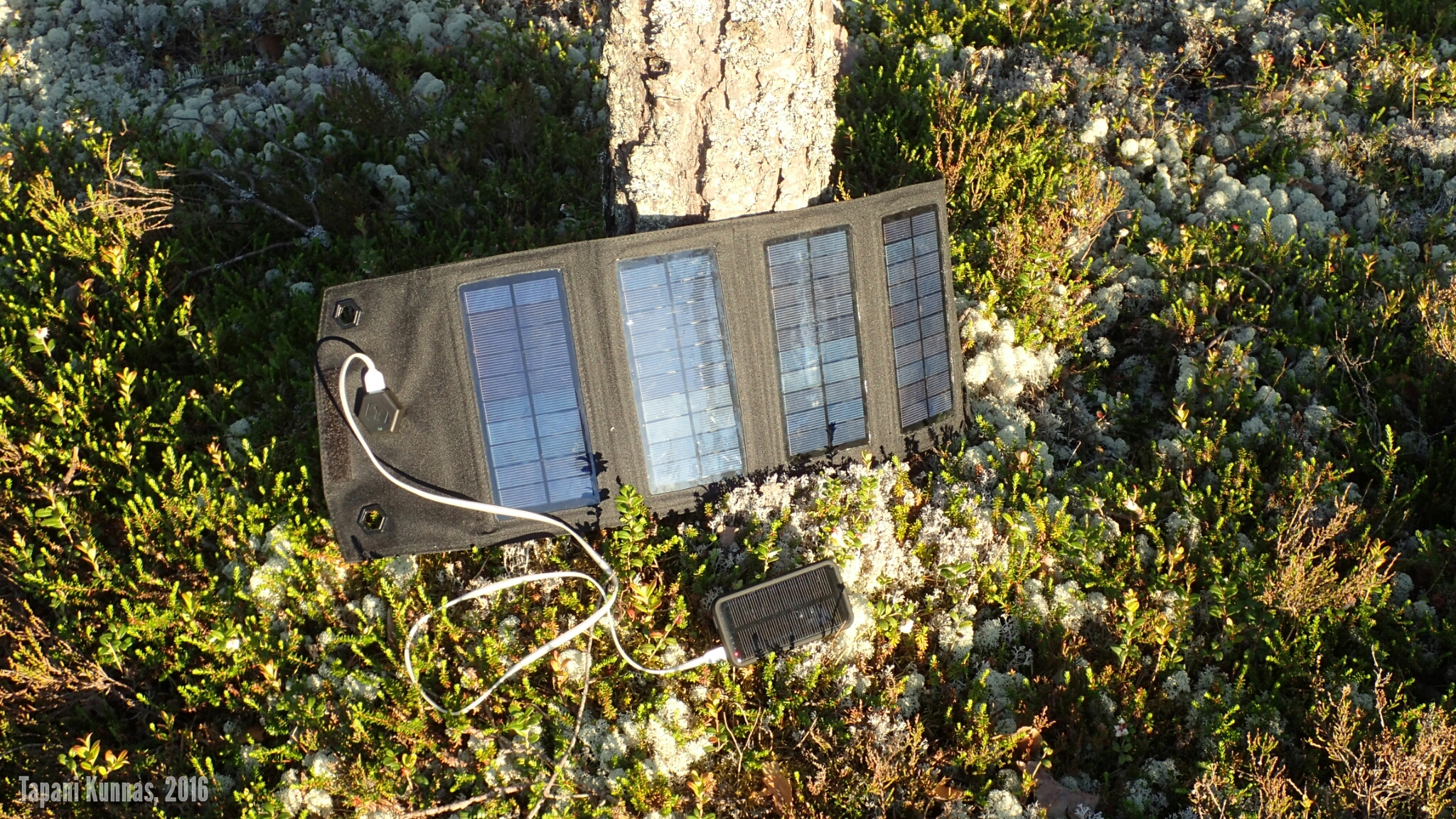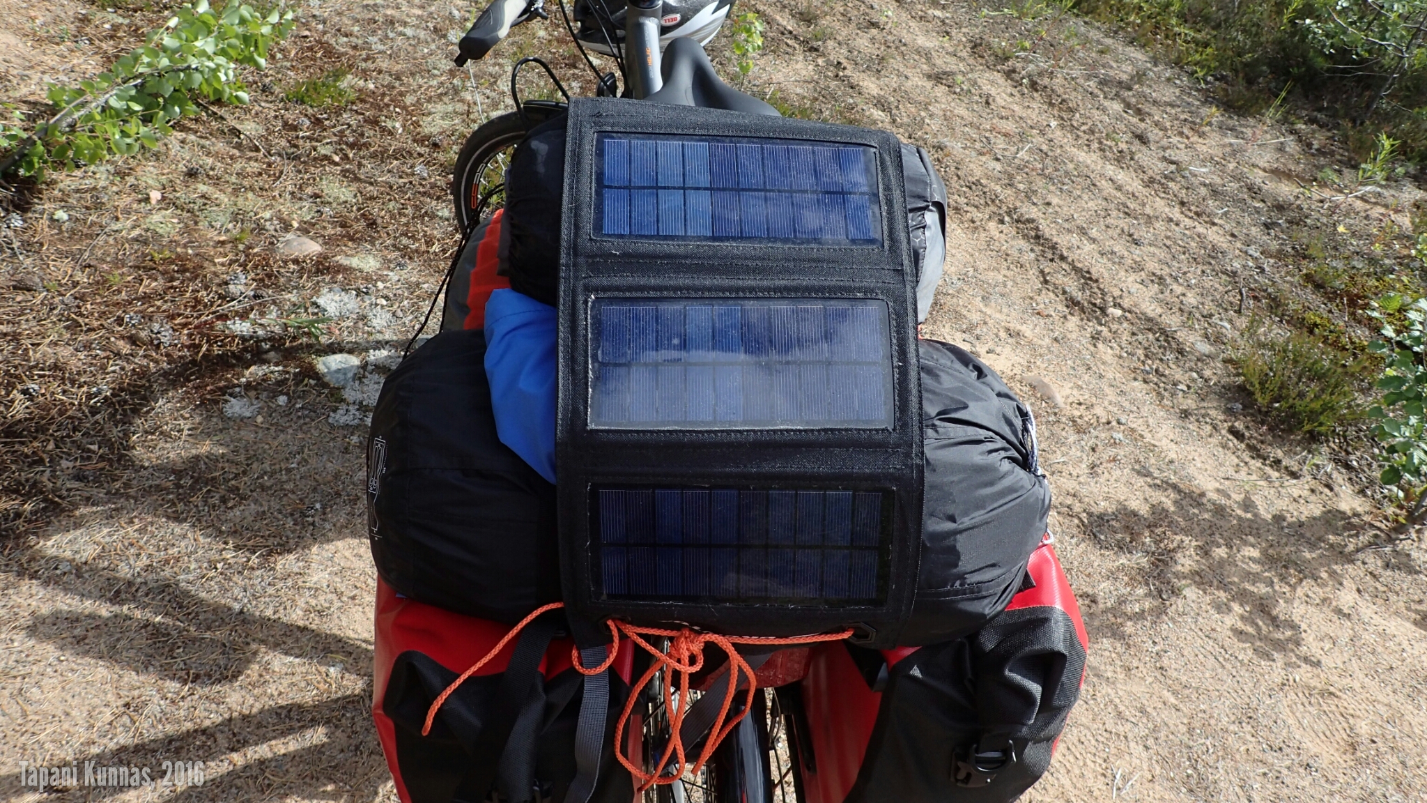 Kuormaan päällimmäiseksi tulee aurinkovoimalani. Se koostuu 5-wattisesta Brunton Explorer -aurinkopaneelista ja 3000 mAh virtapankista. Eilen illalla latasin tabletinpoikasen tästä virtapankista ja nyt on tarkoitus täyttää se aurinkosähköllä. Pilvisten päivien varalta mukana on myös 13000 mAh virtapankki täynnä kotona seinästä otettua sähköä.