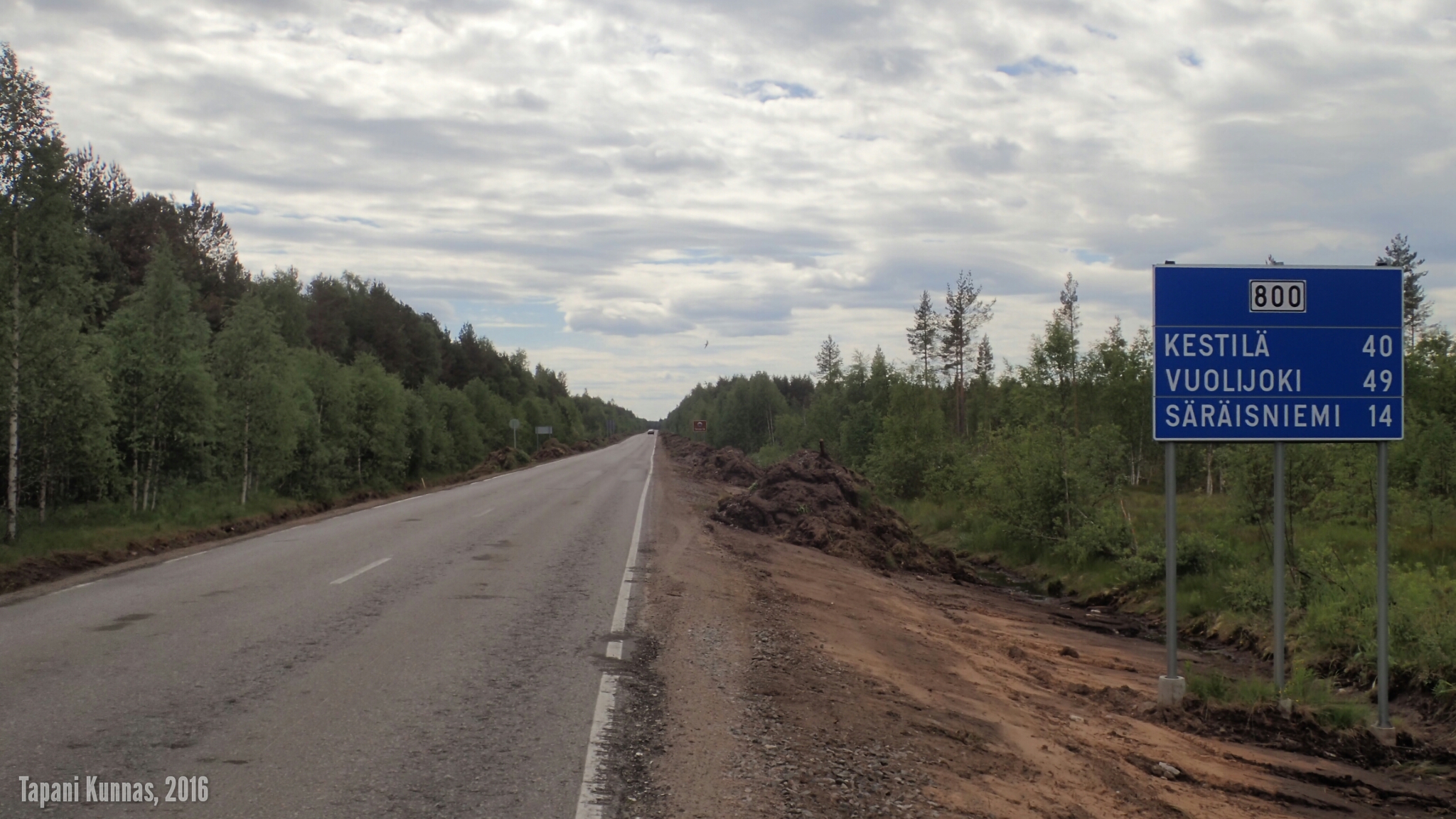 Sitten taas matkaan. Nyt kuljen kolme ja puoli kilometriä tutulla reitillä, sillä tästä kävelin toiseen suuntaan elokuussa 2015 ollessani Rokualle suuntautuneella retkelläni. Nyt saan maksaa eilisestä myötätuulesta: joudun polkemaan suoraan vasten tuulta. On myös lämmin; auringon lämmittämän asfaltin päällä lämpötila keikkuu kolmenkymmenen asteen tuntumassa.