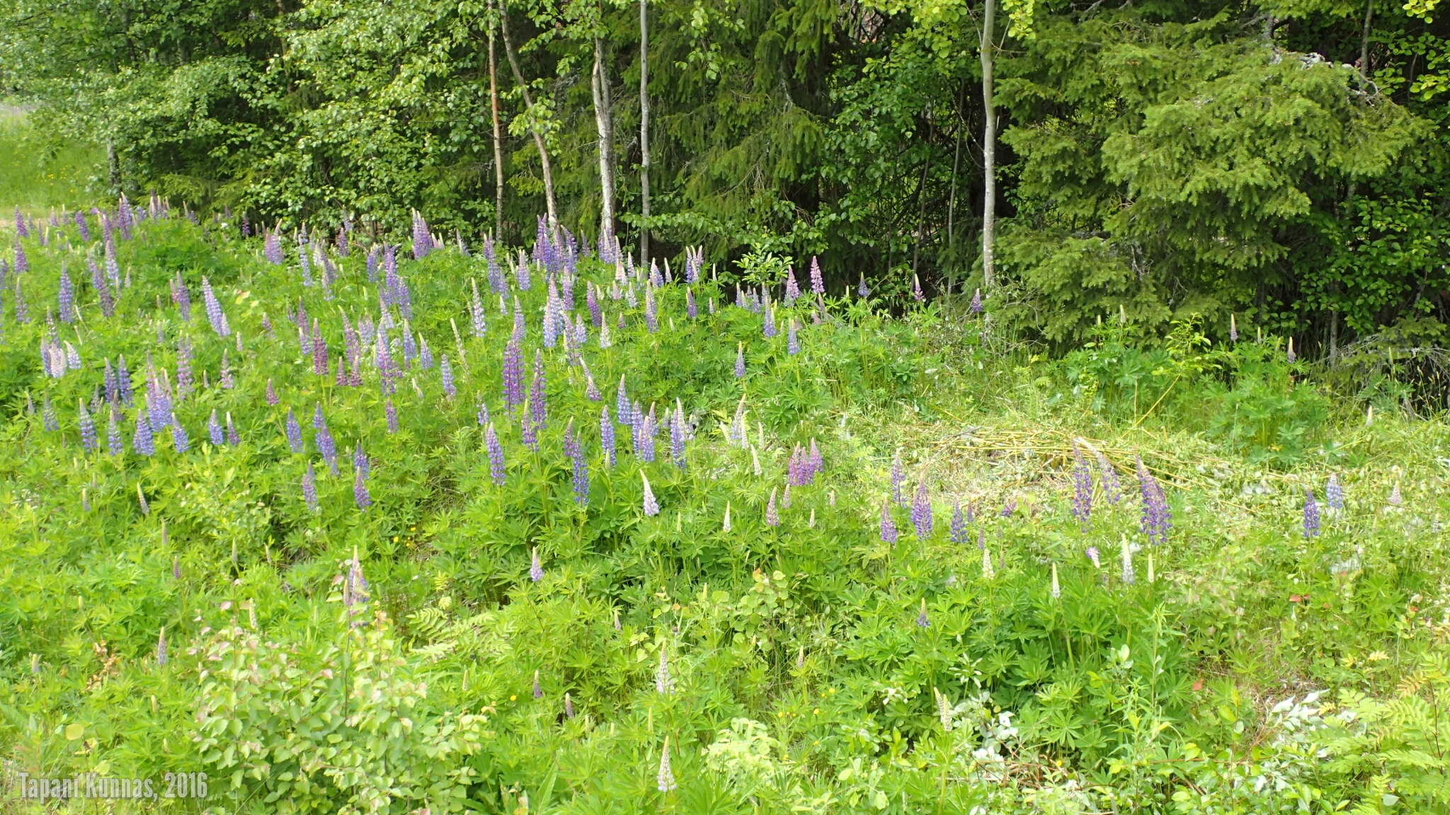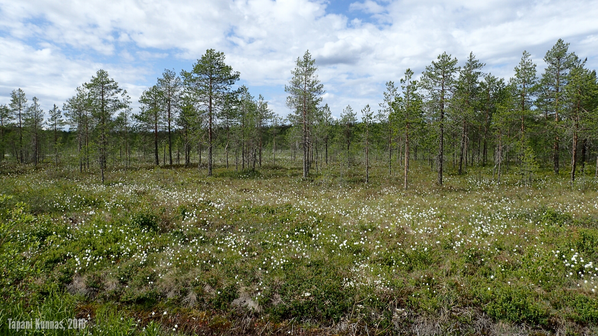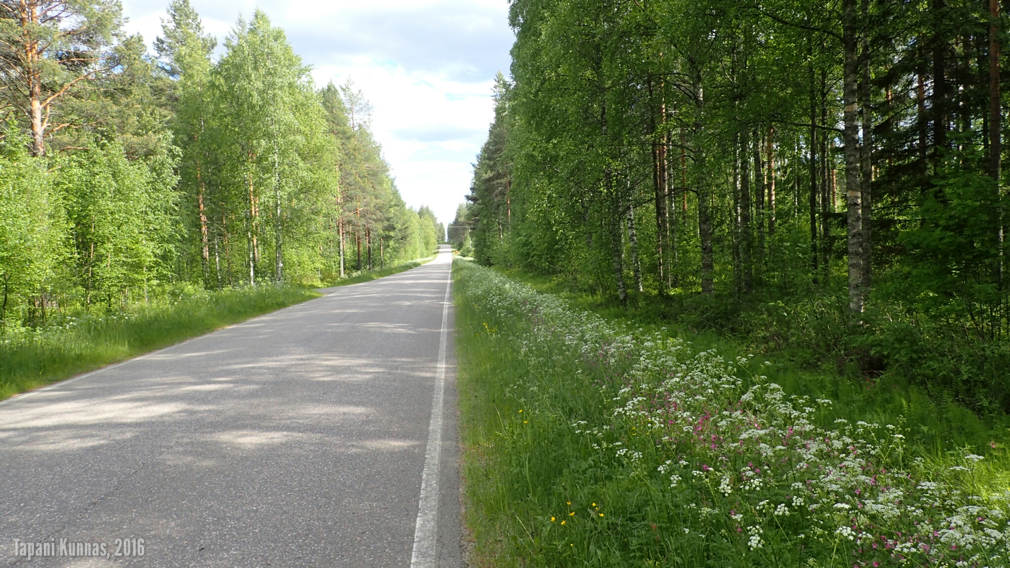 Violetit lupiinit kukkivat tien varressa. Ja niityt ovat niittyleinikeistä keltaisia. Tupasvilla, joka tänä vuonna kukkii erityisen voimakkaasti, värjää suot valkoisiksi. Raviradan ja lentokentän ohituksen jälkeen maasto tien molemmilla puolilla muuttuu kuivaksi kangasmetsäksi ja jäkäläkankaaksi. Poikkean tieltä sivummalle pitämään taukoa. Näissä maastoissa kelpaisi patikoidakin. Maasto muistuttaa hieman Rokuaa: täälläkin on jäkäläisten kumpujen välisissä painanteissa pieniä suolämpäreitä.