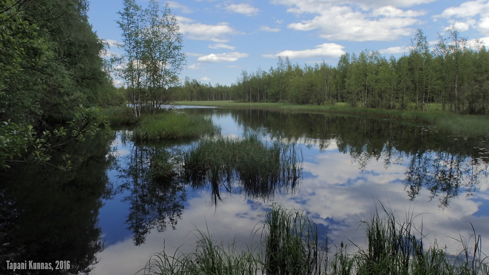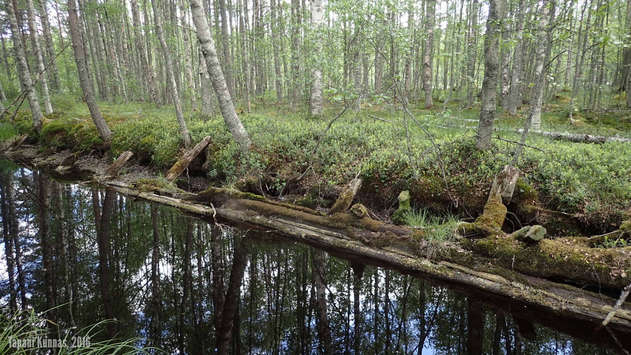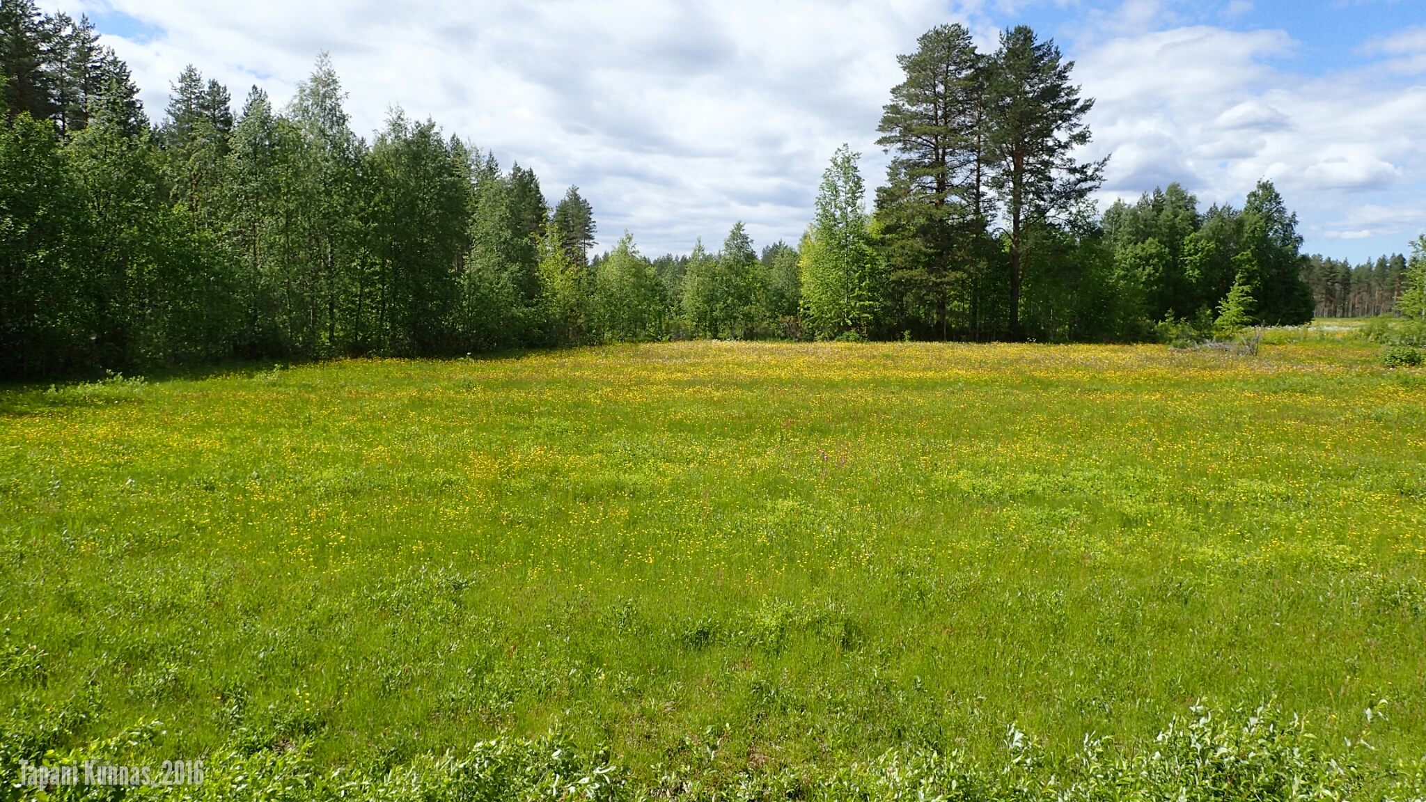 Violetit lupiinit kukkivat tien varressa. Ja niityt ovat niittyleinikeistä keltaisia. Tupasvilla, joka tänä vuonna kukkii erityisen voimakkaasti, värjää suot valkoisiksi. Raviradan ja lentokentän ohituksen jälkeen maasto tien molemmilla puolilla muuttuu kuivaksi kangasmetsäksi ja jäkäläkankaaksi. Poikkean tieltä sivummalle pitämään taukoa. Näissä maastoissa kelpaisi patikoidakin. Maasto muistuttaa hieman Rokuaa: täälläkin on jäkäläisten kumpujen välisissä painanteissa pieniä suolämpäreitä.
