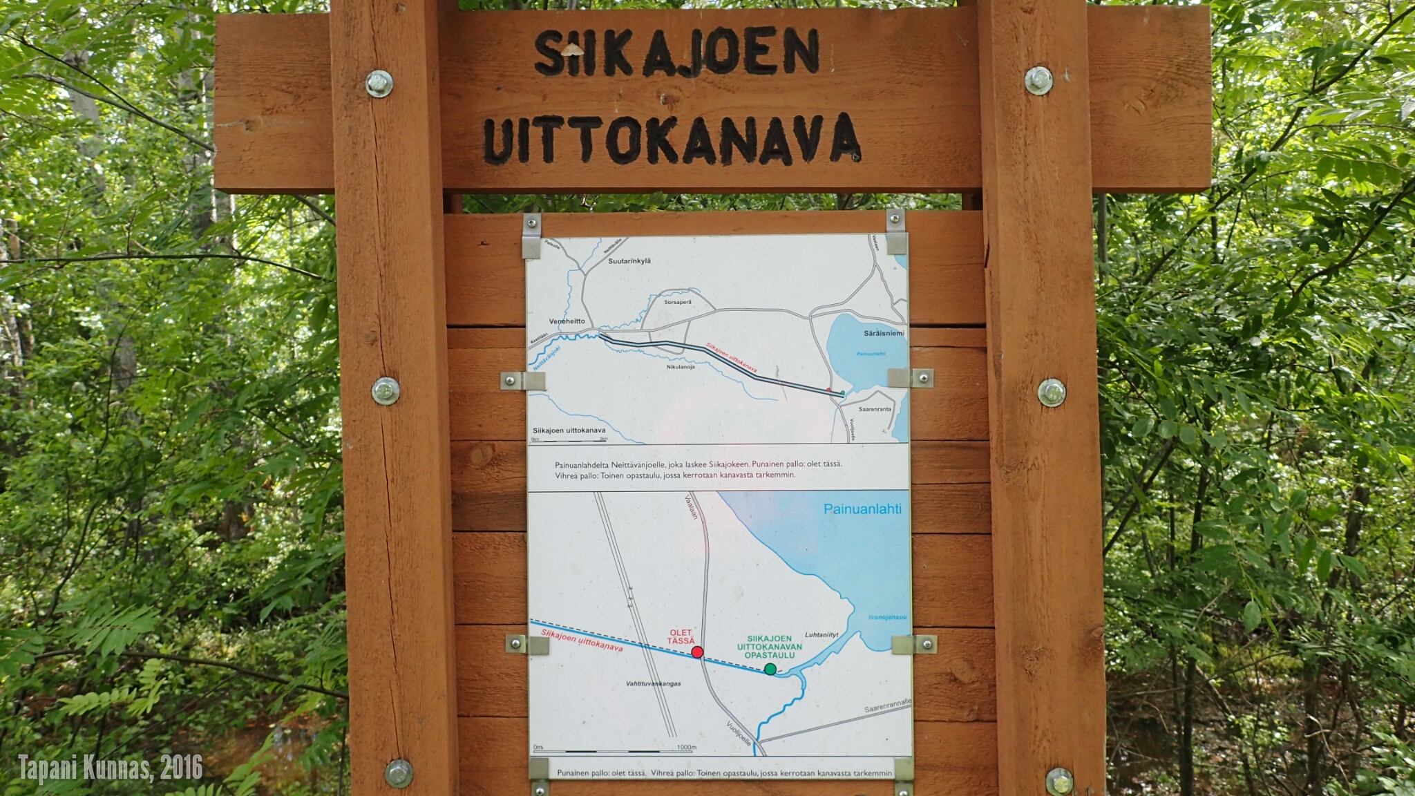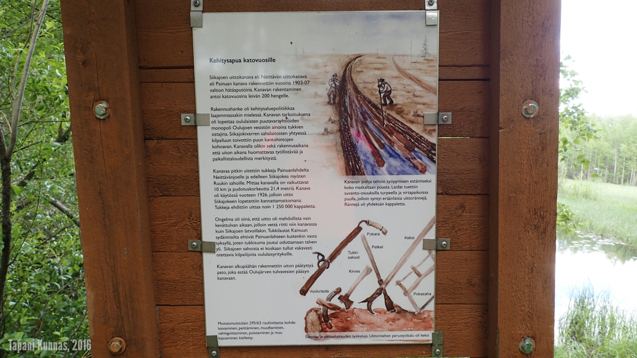 Metsän muututtua jälleen lähes läpitunkemattomaksi ryteiköksi huomaan tien oikealla puolella, vaatimattoman ajopolun varrella, opastaulun. Hidastan, käännyn, ja palaan takaisin katsomaan. ”Siikajoen uittokanava” sanoo taulu. Tekstin alapuolella on kartta, jonka mukaan tien toisella puolella olisi toinen opastaulu, jossa kerrotaan kanavasta tarkemmin. Sinne siis.