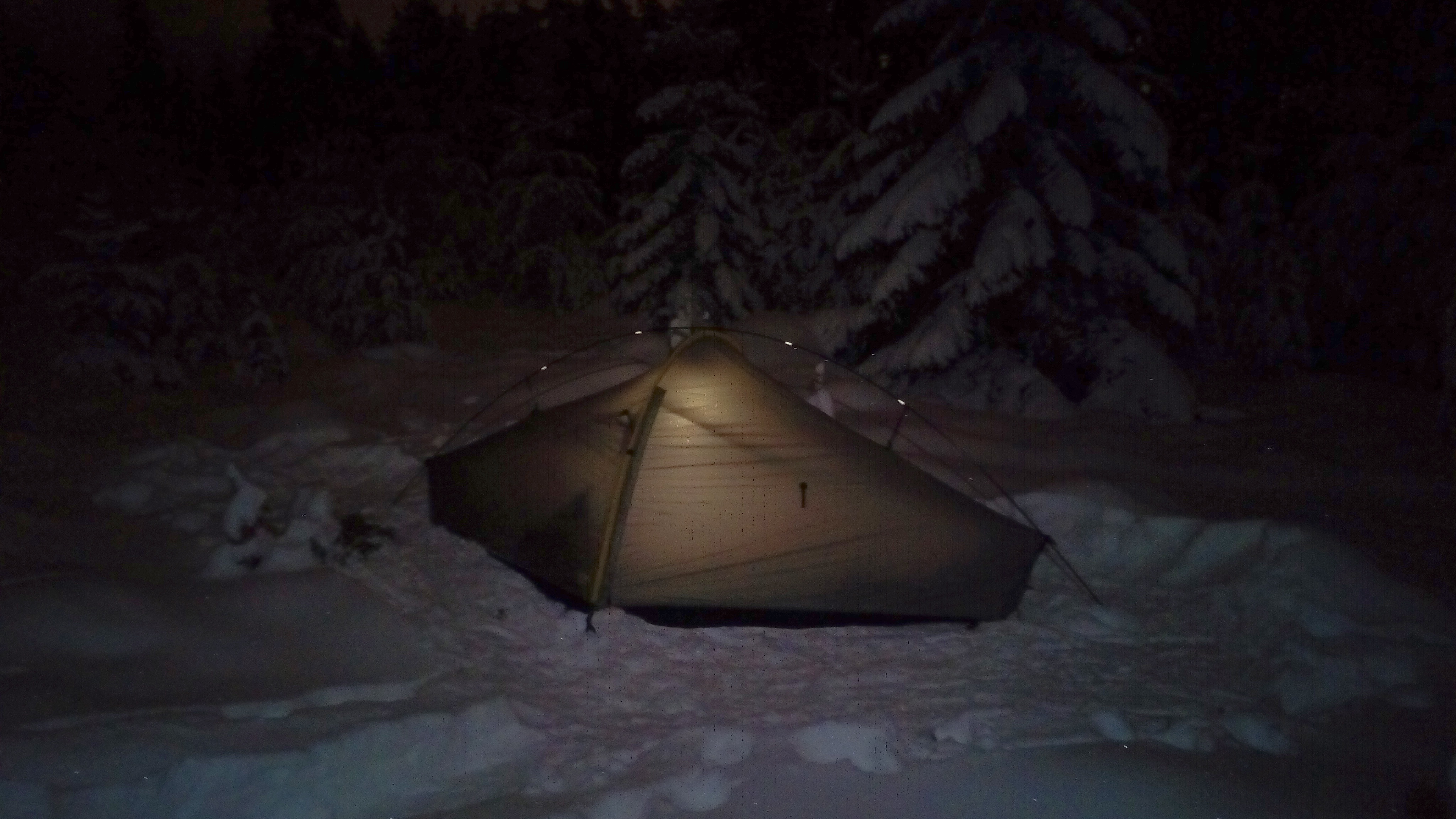Löydän nuoren männikön keskeltä oivallisen paikan leirilleni. Tamppaan teltan kokoisen tontin ja rupean pystyttämään majoitettani. Koska tällä retkellä mukana olevien varusteiden on mahduttava rinkkaan, olen ottanut mukaan pikkutelttani, Tarptent Moment DW:n. Erämaakaksio olisi tällaiselle retkelle aivan liian iso ja painava kuljetettava. Tarptent on erittäin helppo pystytettävä: ensin sujutetaan yksi poikittainen kaari paikalleen, sitten kiinnitetään teltan toinen pääty yhdellä maakiilalla paikalleen, sen jälkeen vedetään teltta suoraksi ja kiinnitetään toinen pääty. Lopuksi kiristetään päädyissä olevien narujen avulla teltta tiukalle. Koska yöllä voi sataa märkää lunta, laitan telttaan myös pitkittäiskaaren, joka lisää majoitteen tukevuutta erityisesti silloin, kun kankaalle tulee tavallista suurempi pystysyyntainen kuorma sateen muodossa. Kovassa tuulessa telttaa voi edelleen tukevoittaa laittamalla sivunarut paikalleen, ja jos sekään ei vielä riitä, voi lisänaruja kiinnittää esimerkiksi kohtiin, joissa pitkittäiskaari kiinnittyy telttaan.