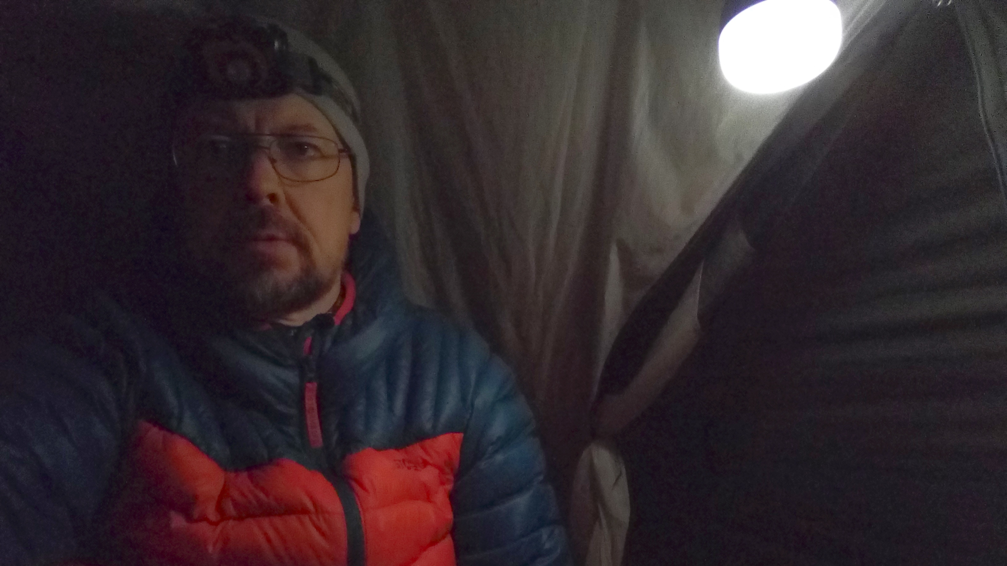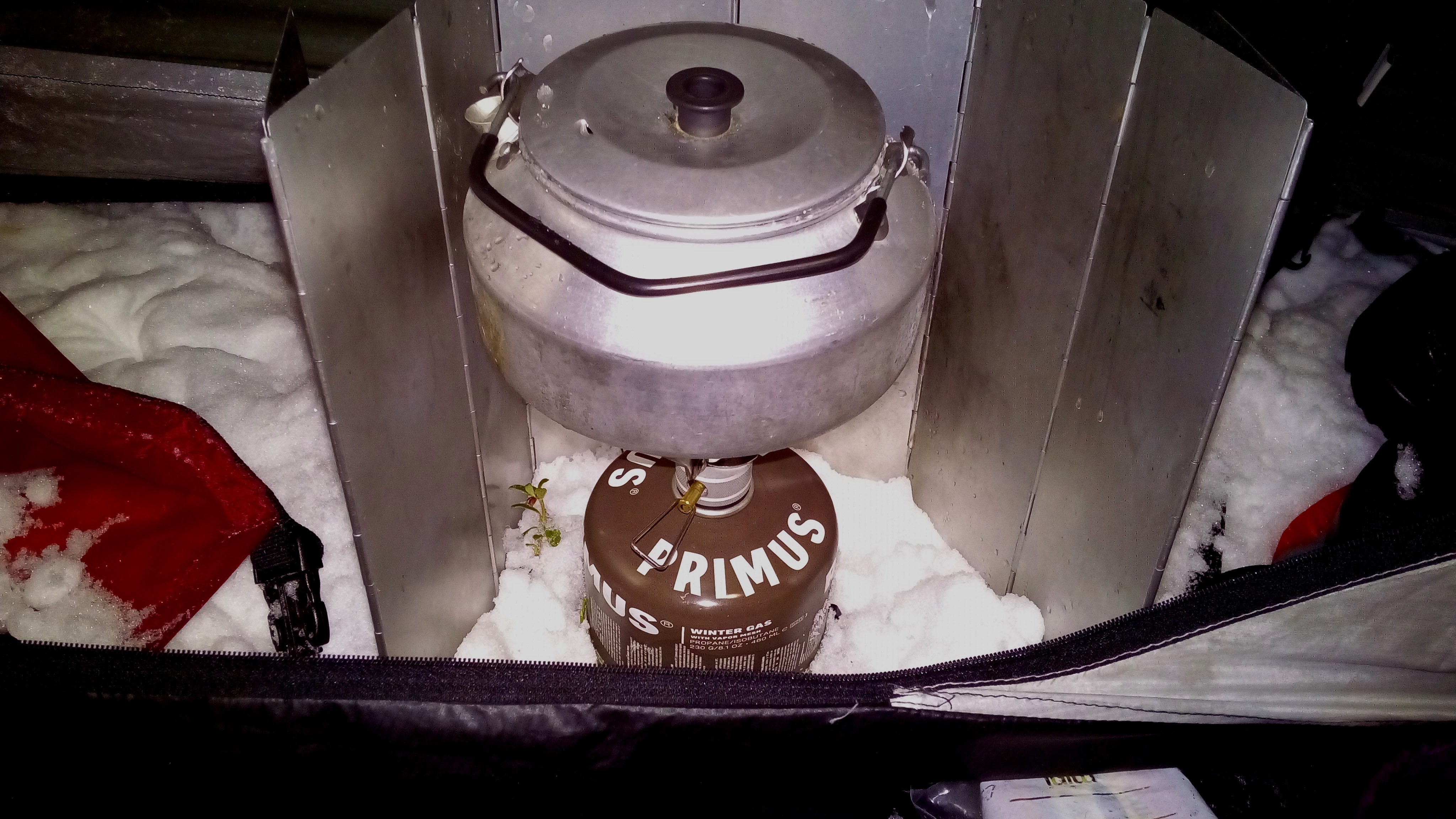 Teltassa tarkenee. Ulkolämpötila on pari astetta nollan yläpuolella, joten teltassa sisällä olisi normaalioloissa noin seitsemän astetta. Eteisessä lunta sulattavan kaasukeittimen myötä lämpötila kohoaa lähelle kymmentä astetta. Ei siis mikään varsinainen talvikeli.