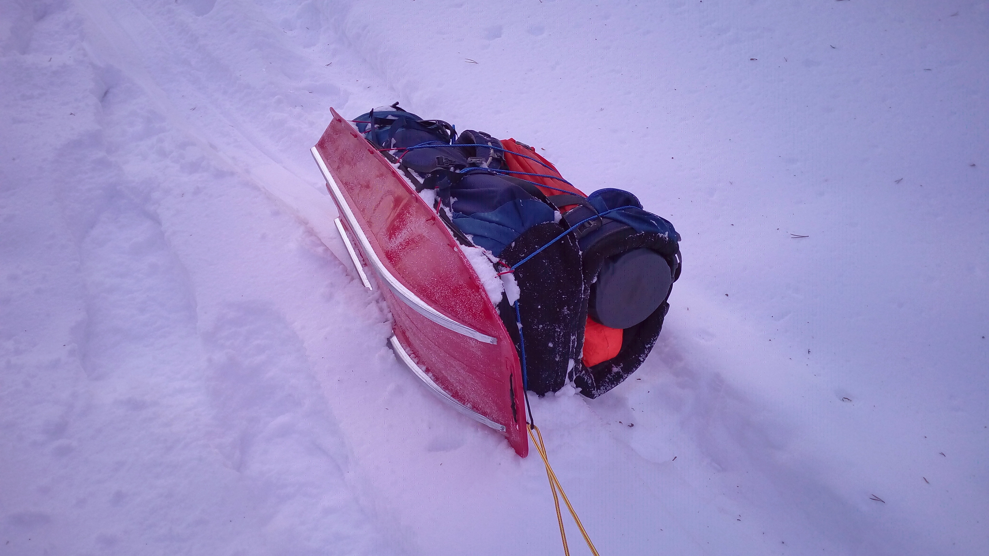 Tässä ei nyt havut auta, joten en ryhdy niitä vaatimaan. Totean, että teoria ja käytäntö lyövät jälleen toisiaan korville – ajatus rinkan kuljettamisesta pulkassa oli hyvä, mutta vain ajatuksena. Käytännössä järjestely ei toimi ollenkaan, koska yhdistelmän painopiste jää niin korkealle, että ei tarvita suurtakaan kallistusta pulkan kaatamiseksi. Tämä olisi kyllä pitänyt jo etukäteen tajuta. Olen jälleen kerran todistanut oikeaksi Juhani Tammisen teesin ”90-prosenttinen keskittyminen tuottaa 50-prosenttisen tuloksen”. Ikävä oppia kaikki.