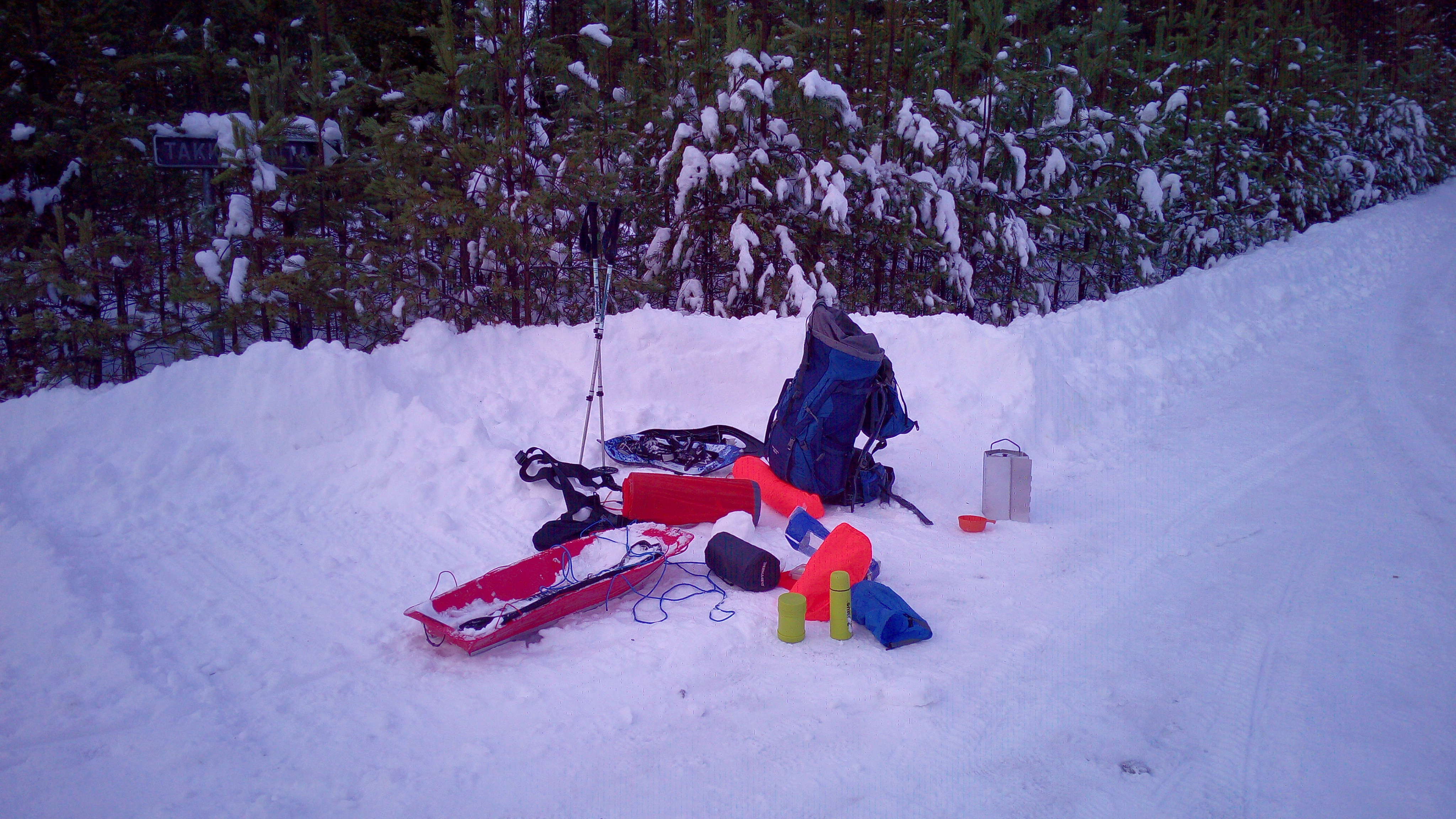 Varusteiden kuljetustapa mietityttää. Helpointa olisi kuljettaa ne isossa ahkiossa, mutta sellaisen kanssa paikallisliikenteen linja-autossa matkustaminen on vaivalloista. Jospa pakkaisin varusteet rinkkaan ja ottaisin pikkupulkan mukaan. Rinkka selässä ja pulkka käsimatkatavarana sovin helposti onnikan kyytiin. Bussimatkan jälkeen laitan sitten rinkan pulkkaan ja vedän sitä perässäni. Suunnitelma vaikuttaa hyvältä.