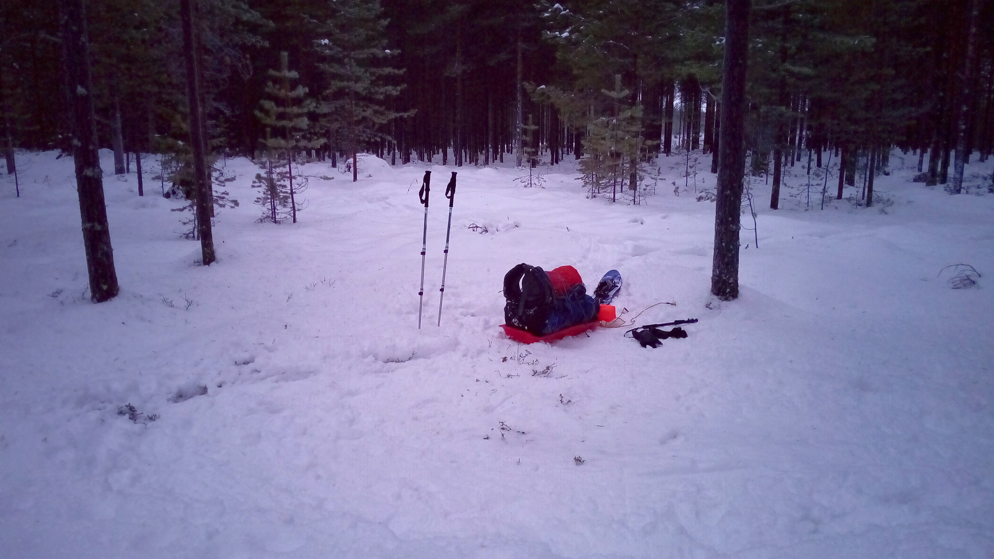 Kiireettömien aamutoimien ja leirin purkamisen jälkeen lähden matkaan. Tarkoitukseni on läpsytellä tästä lumikengät jalassa lähimmälle ajopolulle, josta jatkan lumitilanteen mukaan joko lumikengillä tai ilman. Muutaman kymmenen metrin jälkeen pulkka kellahtaa kyljelleen. Suoristan sen ja jatkan matkaa. Parin metrin päässä pulkka on taas nurin. Suoristan sen ja jatkan matkaa. Etenen metrin verran ja pulkka kippaa jälleen kyljelleen. Perkele!