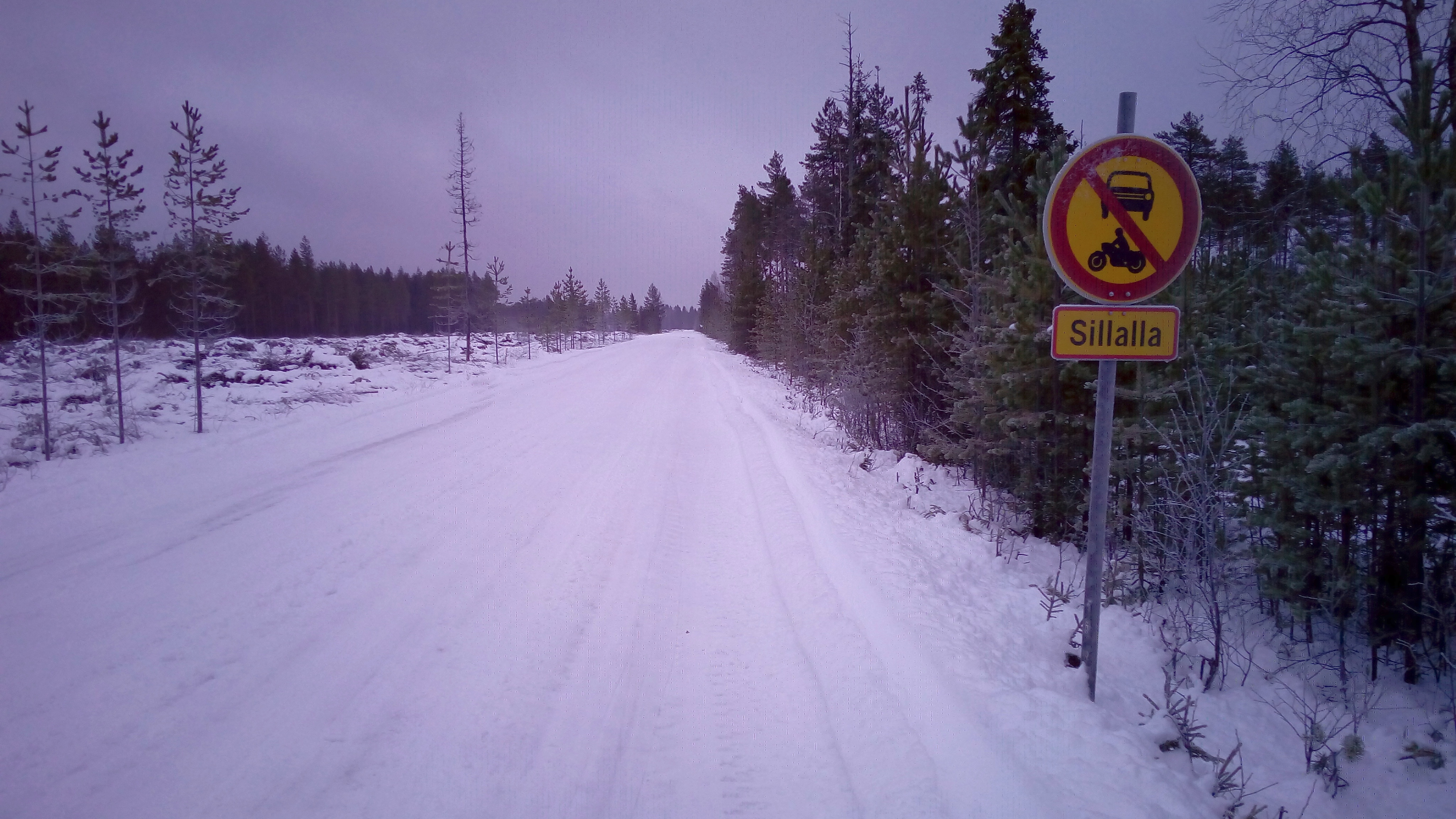 Minulla ei ole kiveen hakattua reittisuunnitelmaa. Otan seuraaviksi kiintopisteiksi rautatien ylityksen ja E75-tien ylityksen – niiden jälkeen olen risteyksessä, josta voin jatkaa matkaa kolmeen eri suuntaan. Päätän jatkosta sitten siellä. Ajopolku muuttuu metsäautotieksi, jota pitkin on jäljistä päätellen kuljettu lähinnä moottorikelkoilla, traktoreilla ja isoilla autoilla. Tie on aurattu lumilingolla, mutta vain yhdellä pyyhkäisyllä, joten aurattu osuus on kapea. Joudun sen vuoksi olemaan koko ajan varpaillani, jotta huomaisin mahdollisimman aikaisin minua edestä tai takaa lähestyvät ajoneuvot ja ehtisin väistää.