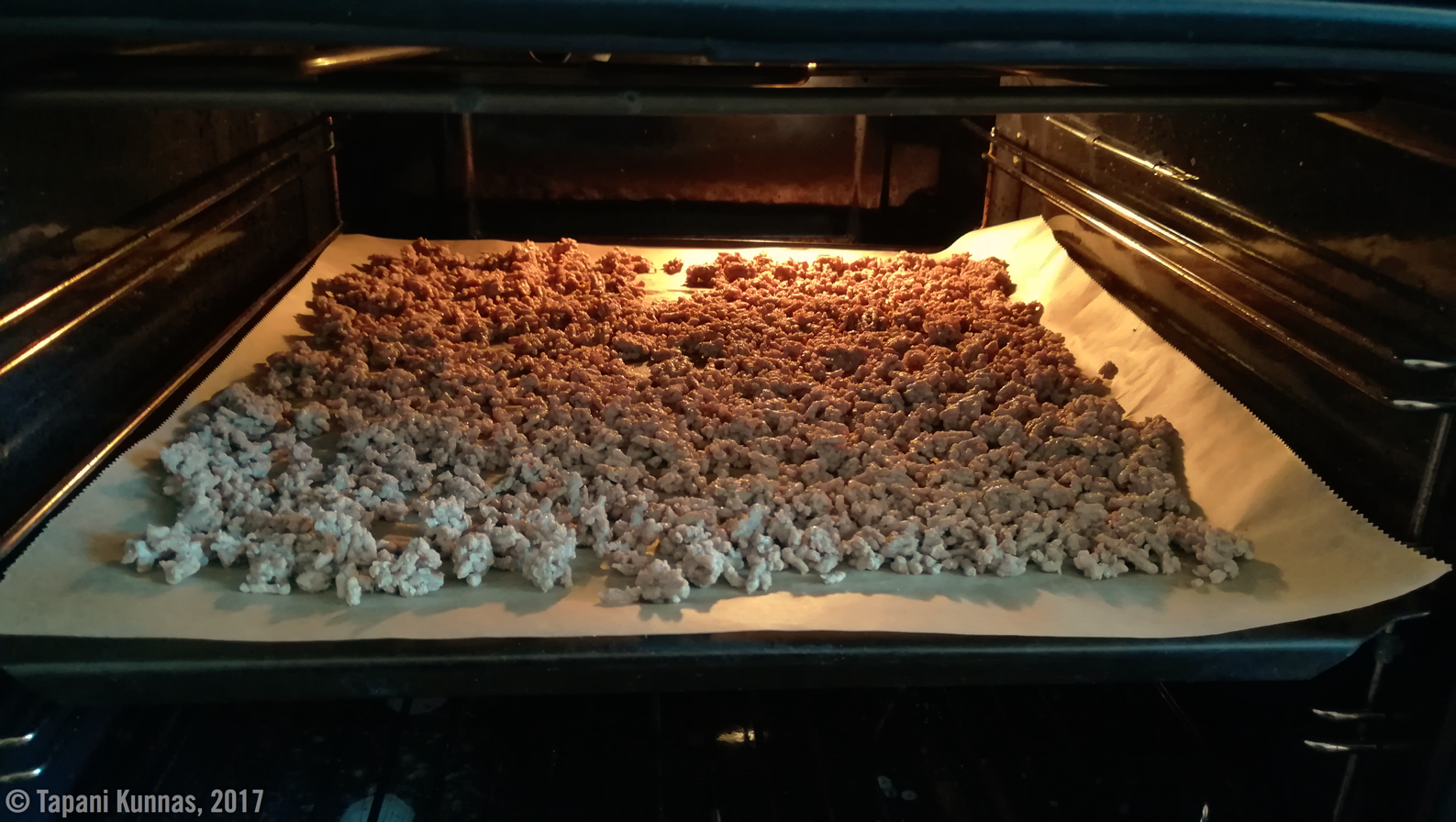 Seuraavana päivänä uuniin pääsee jauheliha. Ennen kuivatusta kypsennän sen paistinpannulla miedolla lämmöllä – tarkoitus ei ole ruskistaa lihaa, vaan irrottaa siitä rasva. Paljoahan sitä ei kymmenprosenttisessa jauhelihassa edes ole. Kypsän lihan valutan talouspaperin päällä ja sitten levitän uunipellille samaan tapaan kuin edellisen päivän kasvissuikaleet.