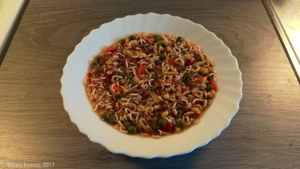 Olen oikein tyytyväinen. Kyllä tällainen vaiva kannattaa nähdä, kun sillä saa kolme neljännestä ruoka-ainesten painosta pois ja lopputulos on näinkin maittava. Nuudeleiden sijaan ruokaan voisi lisätä myös esimerkiksi pikariisiä, kuskusia tai vaikka perunamuusijauhetta. Näin yksinkertaisista lähtökohdista saa monenlaisia aterioita. Lisäksi mausteita vaihtelemalla saa variaatioita vielä paljon lisää.