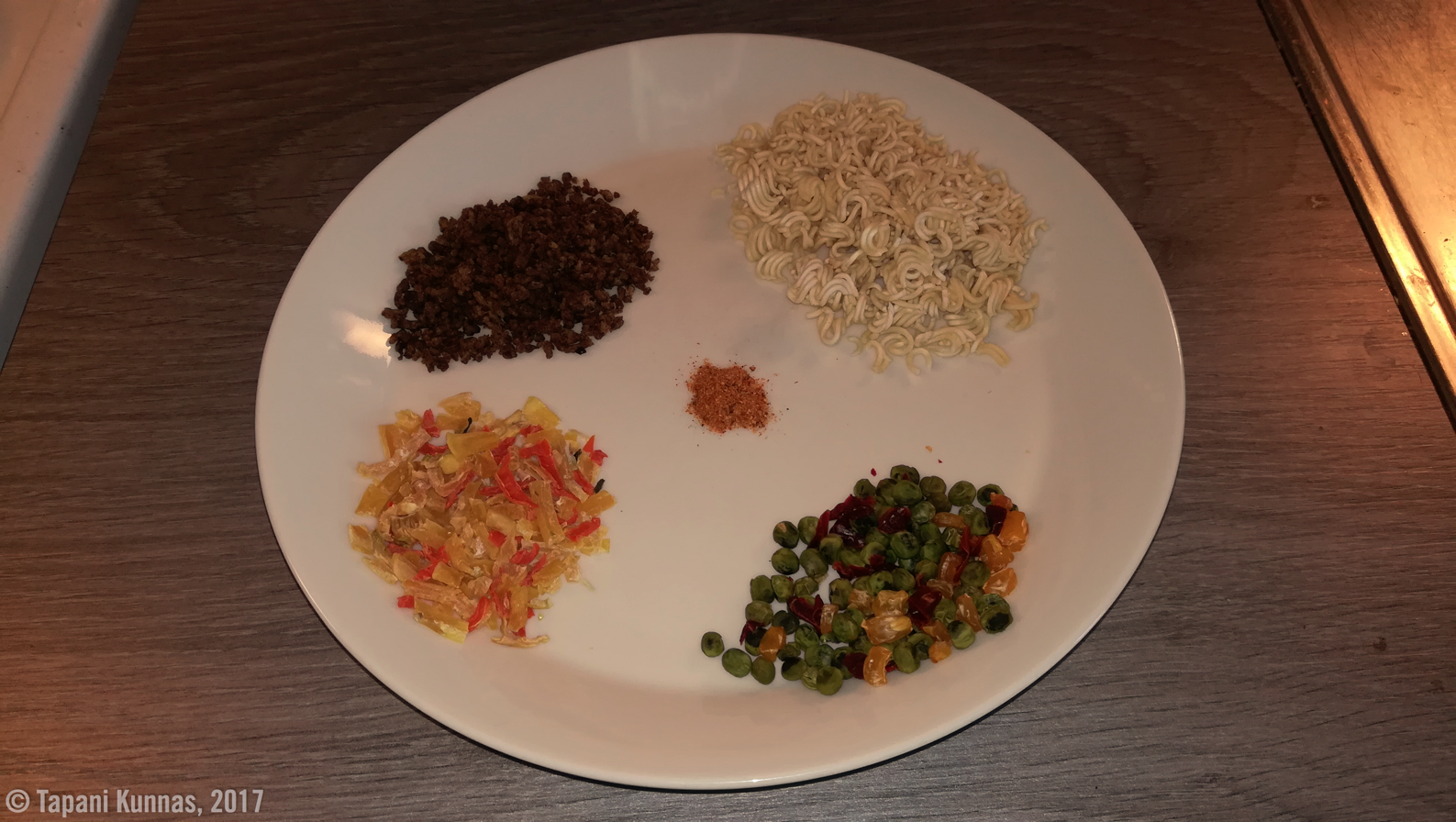 10 grammaa jauhelihaa, 10 grammaa kasvissuikaleita ja 10 grammaa herne-maissi-paprikaa. Mausteeksi kaksi maustemitallista grillausmaustetta. Sitten vettä riittävästi, kansi kiinni ja odottelua. Lisäksi annokseen tulee vielä 25 grammaa nuudeleita, mutta ne lisään vasta myöhemmin. Otsikkokuvassa nämä ainekset ovat lautasella valmiina purkkiin laitettavaksi.