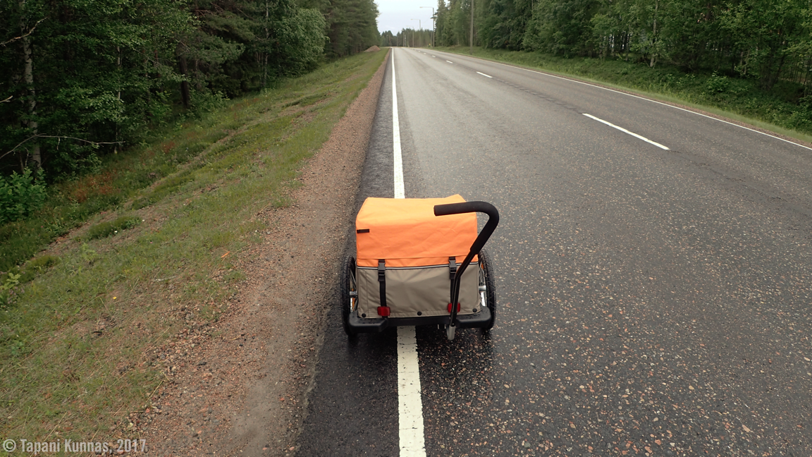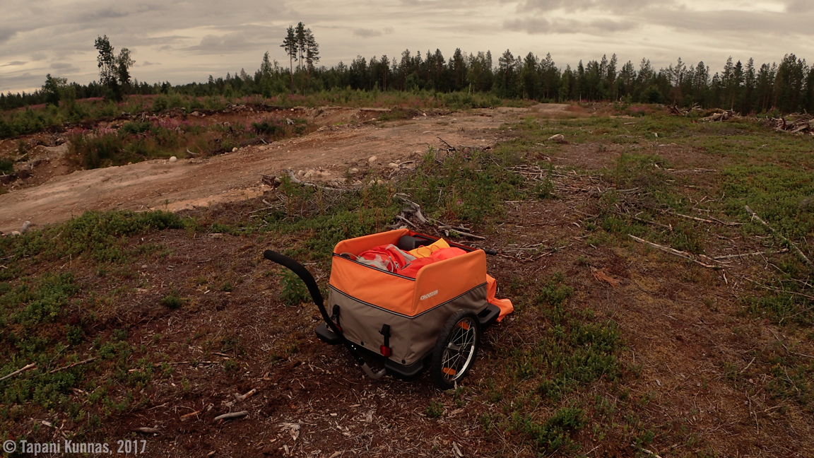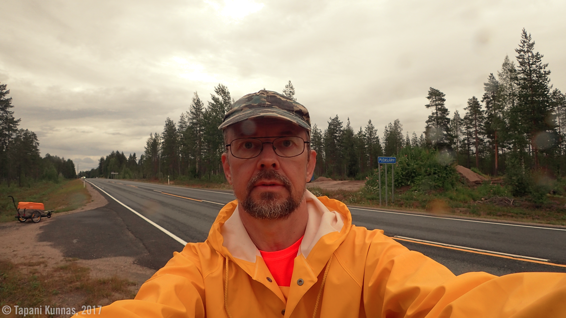 Tuulinen yö takasi hyvät unet. Viileässä on niin paljon parempi nukkua kuin kuumassa – tai vaikka ihan normaalilämmössäkin. Hikoilu on nyt muutenkin ohitse, sillä tänä aamuna ilma tuntuu erilaiselta kuin maantievaelluksen aiempina päivinä. Nyt on kosteaa. Tästä on tulossa ensimmäinen sadepäivä. Sade saattaa alkaa piankin, mutta en anna tämän sotkea aamurutiinejani. Syön aamiaisen, pakkaan tavarat ja puran leirin. Sitten lähden kulkemaan, ensin runsaan kilometrin matka isolle tielle ja siitä sitten taas kohti Pudasjärveä.