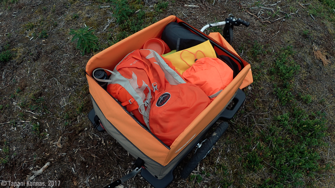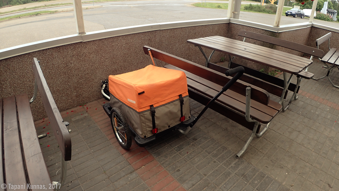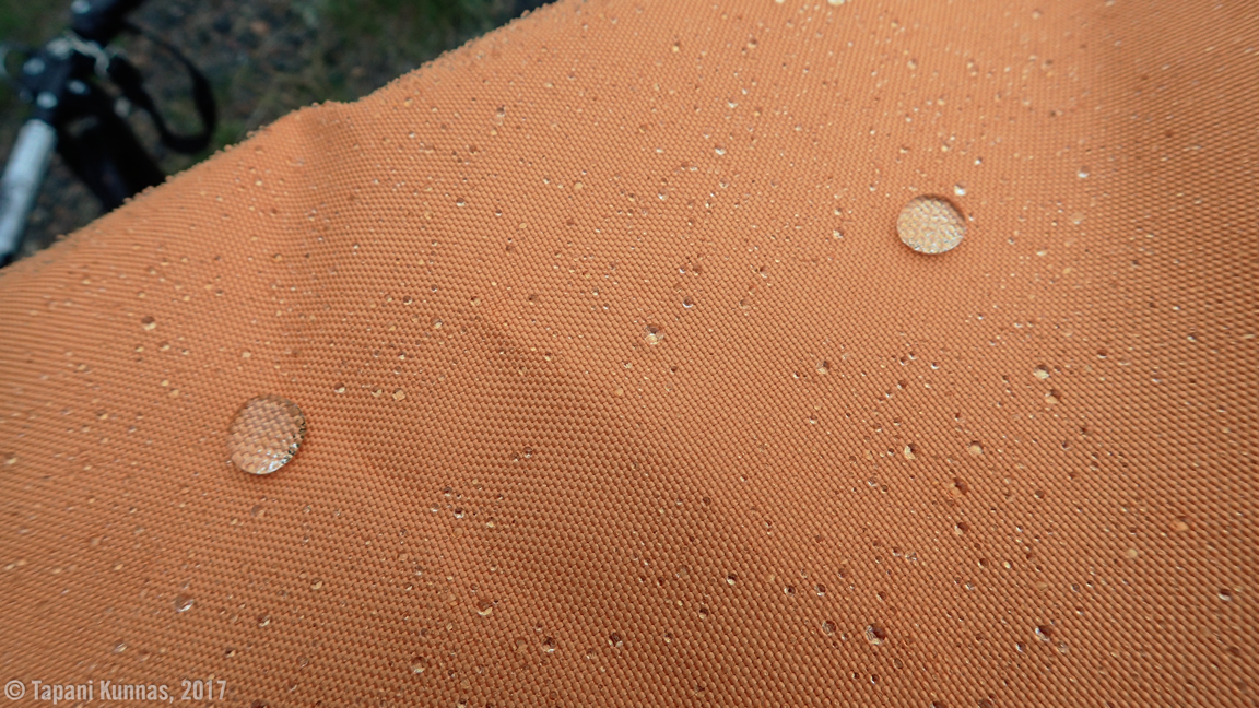 Paitsi, että sade viilentää ilmaa mukavasti, on siitä minulle toinenkin hyöty: nyt saan selville, kuinka vedenpitävä kärryni kuomun kangas on. Kotona olen sitä testannut vesihanan alla ja havainnut kankaan vettä hylkiväksi. Pitempään jatkuva sade on kuitenkin eri asia kuin hetkellinen hanavedellä lutraaminen. Vähitellen vettä alkaa tihkua kankaan läpi, mutta niin vähän, ettei se oikeastaan kastele mitään. Ja vaikka kastelisikin, niin ei sekään haittaisi, sillä olen pakannut kaikki tavarani vedenpitäviin kuivapusseihin.