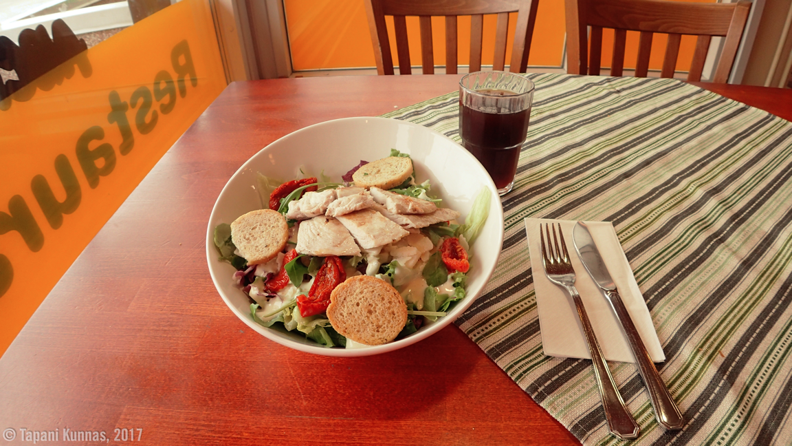 Lykkään lounasta noin puolellatoista tunnilla tavanomaisesta voidakseni nauttia sen Koillisportissa. Olen syönyt retken alkupäivät enemmän tai vähemmän säilöttyä ruokaa, joten nyt haluan tuoretta: tilaan lounaakseni kana-caesarsalaatin. Ai että tuoreet kasvikset maistuvatkin hyvältä! Eikä toki sekään haittaa mitään, että saan rauhassa istuskella ja odottaa, että annos tuodaan valmiina eteeni. Maantievaellus on omalla tavallaan aika karua matkantekoa, joten pieni luksus on paikallaan silloin, kun siihen tarjoutuu mahdollisuus.