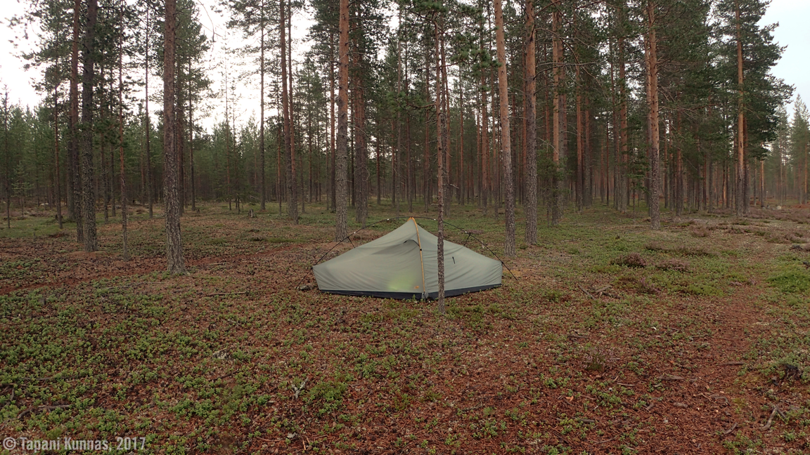 Paras on hyvän pahin vihollinen, mutta nyt tarjolla on niin mainioita leiripaikkoja, että voin nirsoilla koko rahalla ja valita itselleni ihan sen parhaista parhaan. Näiden leiripaikkojen osalta maantievaelluksestani on muodostumassa nousujohteinen projekti: ensimmäisen yön vietin kelvollisessa paikassa, toinen oli hyvä, kolmas erinomainen ja tämä neljäs menee sitten jo arviointiskaalan yläpäästä yli. Tässä on kuivaa, harvaa kangasmetsää, jossa puiden välinen maanpinta on kauttaaltaan tasaista, vaakasuoraa ja juuri sopivan – mutta ei liian – pehmeää telttakiilojen kiinnitykseen. Hyviä teltan paikkoja on täällä ihan tuhlattavaksi asti – tänne voisi majoittaa vaikka keskikokoisen partioleirin.