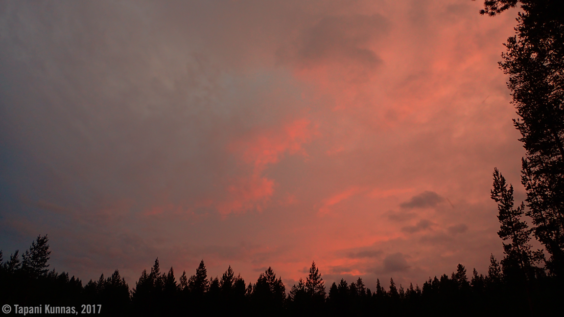 Oikeastaan ainoa, mikä puuttuu, on tuuli – sääennusteen mukaan täällä pitäisi puhaltaa 4 m/s tuuli, mutta kyllä tässä on aivan tyyntä. En anna mokoman pikkuseikan pilata tunnelmaani. Ja illan mittaan pilvipeitekin repeilee sillä tavoin, että saan ihailla kauniisti punertavia iltapilviä ennen nukkumaanmenoa. On taas kerran hienoa olla retkellä!