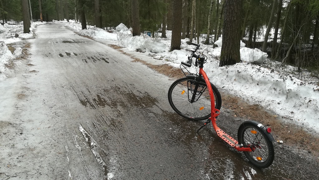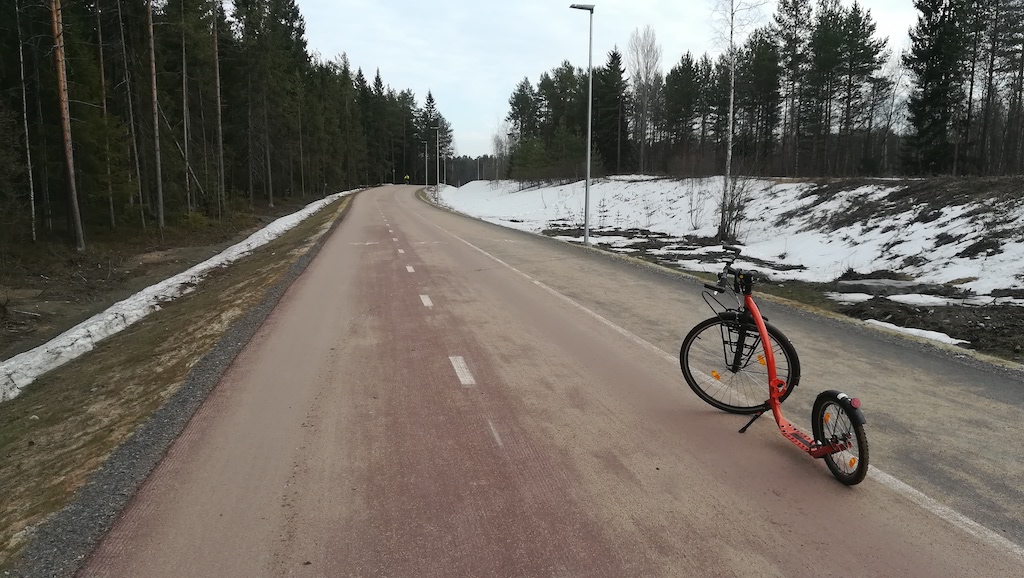 Lankalauantaina on kevät jo niin pitkällä, etten malta odottaa kikkarikauden avauksen kanssa enää pitemmälle. Osasyynä tähän on Facebookin Kickbike-harrastajien ryhmä, johon kuulun, ja johon on viime päivinä ilmestynyt lajitoverien lähettämiä kuvia kikkarilenkeiltä. Näyttää sen verran mukavalta, että onhan minunkin päästävä – vaikka kelit eivät vielä parhaimmillaan olekaan. Hiekoitushiekkojen poisto pyöräteiltä on vasta aloitettu täällä Perämeren Pariisissa. Saan kauden kuitenkin avattua mukavalla kahdeksan kilometrin pituisella lenkillä.